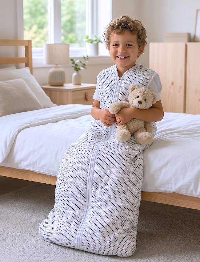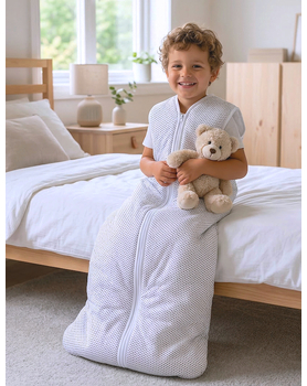 Der Kinderschlafsack hat ein großzügiges Design, sodass sich dein Kind frei bewegen kann. So liegt dein Kind bequem, ohne dass der Schlafsack einengt oder die Bewegungsfreiheit einschränkt.